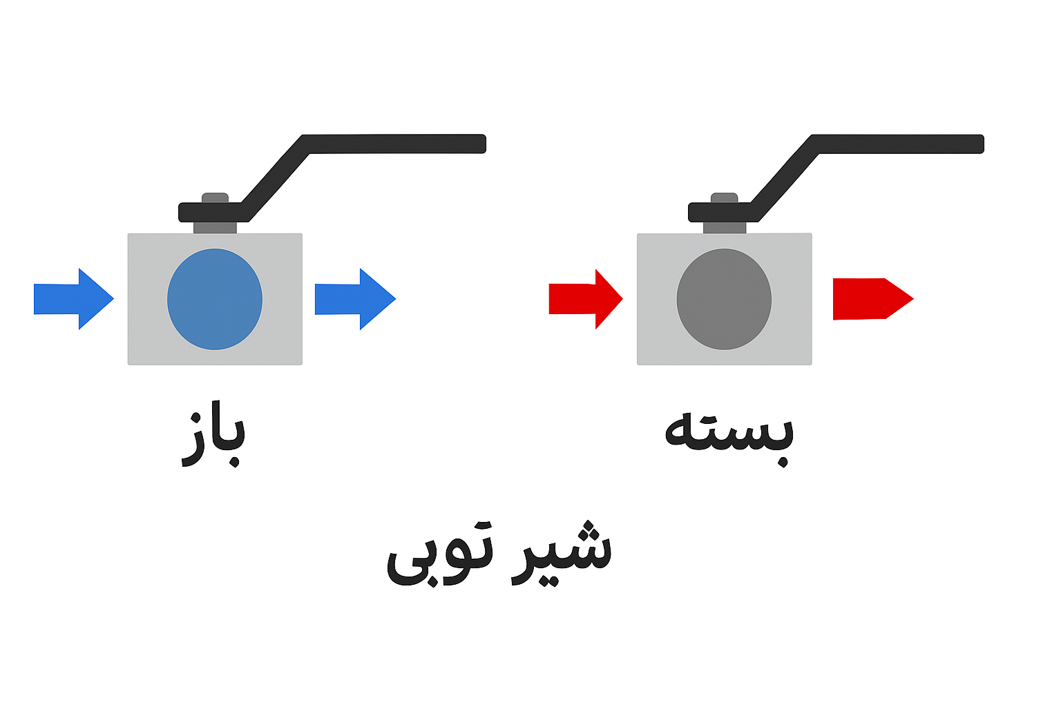 شیر توپی با استفاده از یک توپ (ball) سوراخدار درون محفظه، اجازه عبور یا قطع جریان را میدهد. با چرخاندن اهرم 90 درجه: