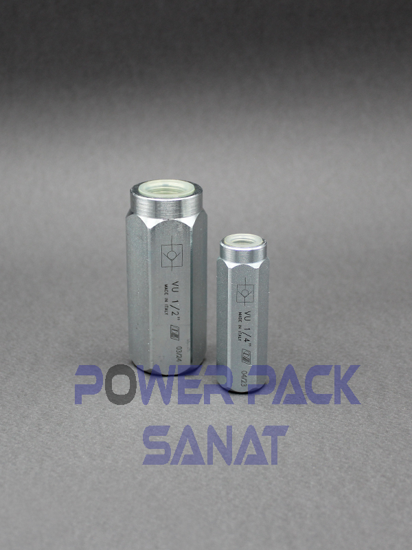 شیر یک‌طرفه (چک‌والو) مدل VU از برند Oleoweb ایتالیا برای جلوگیری از برگشت جریان روغن در سیستم‌های هیدرولیکی استفاده می‌شود. این شیر در یک جهت کاملاً باز است و در جهت مخالف به صورت اتوماتیک بسته می‌ماند. طراحی رزوه‌ای آن نصب را سریع و آسان کرده و در سایزهای مختلف قابل استفاده است.